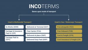 El primer grupo incluye siete (7) Incoterms que pueden utilizarse en cualquier modo de transporte. Estos pueden ser utilizados incluso cuando no se utiliza el transporte marítimo. Incoterms EXW, FCA, CPT, CIP, DAT, DAP y DDP pertenece a este grupo. El segundo grupo incluye cuatro incoterms que se utilizan en el mar o las vías navegables interiores solamente. Esto se debe a que en estos incoterms el punto de entrega y el lugar de destino son ambos puertos marítimos. Incoterms FAS, FOB, CFR y CIF pertenece a este segundo grupo.