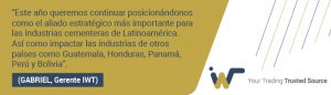 En este marco IWT, se ha consolidado como el aliado y proveedor estratégico de las cementeras, ofreciendo sus servicios de compra de insumos, equipos y materias primas, además de un servicio con alta disposición y eficacia que aporta a los procesos de desarrollo de la empresa.
